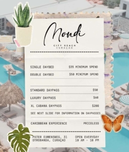 Go big with our Cabana XL for $200, the ultimate beachside escape. Enjoy extra space and luxury with your choice of still or sparkling water, 2 towels, and your choice of a bottle of wine or prosecco. Plus, a Mondi snack platter to complete the experience. From 10:00 to sunset.
